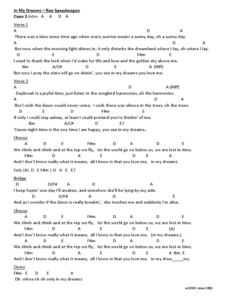In My Dreams Chords by Reo Speedwagon Learn to play guitar by chord / tabs using chord diagrams, transpose the key, watch video lessons and much more IN MY DREAMS (Reo Speedwagon) Tabbed by Nané Mieres (Uruguay) Capo 2 Verse 1 A A There was a time some time a go A sus D Whenever the sun rise meant a sunny day D A Oh!REO Speedwagon frontman Kevin Cronin sings of unrequited love in their hit song 'In My Dreams' The track was the third single from their 1987 Album 'Life As We Know It' and it peaked at